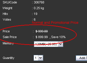 Normal and Promotional PricesDefault price groups are Normal and Promotion. You can easily update your prices in the administration area under Product Catalog : Pricing. If you have any promotional product, just enter the promotion price and the system will automatically calculate the percentage for display. |