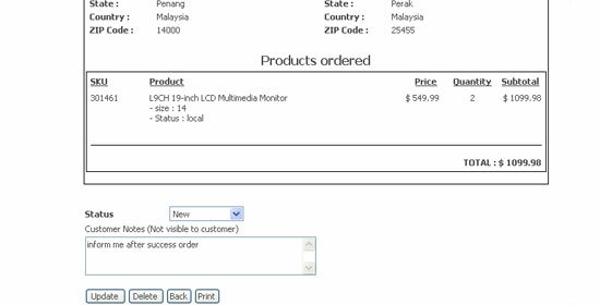 You can view order records of the customer. You may not modify the existing data but you can still alter the order status, PO number and other info. which are alterable. Click Update to commit changes.