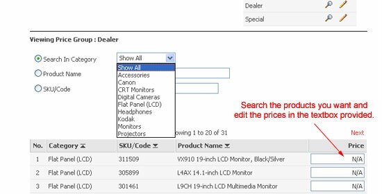 Go to the Product link > Pricing, to manage your products prices. There are 2 price groups named 'Normal' and 'Promotion' are created by default.