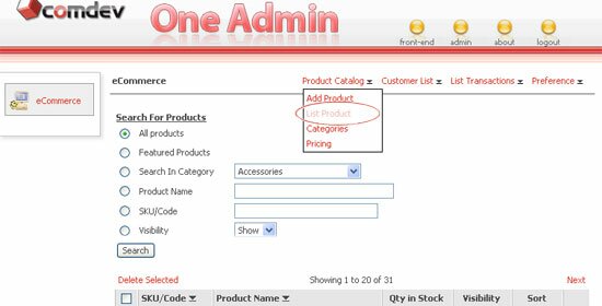 To view all your products in your online catalog, go to the Product link > List Product. You can shorten the list results by perform search. Click one of the search option to search by category, product name or product code and click Search.