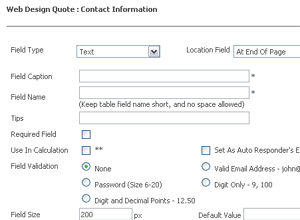 Field TypesThere are different field types that you can use for your form:- Label, Text Field, Text Area, File Upload, Drop Down Selection, Multiple Selection, Radio Button, Checkbox, and Calculation Fields. |
