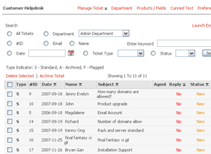 List of TicketsYour customer tickets are listed with the Reply=No status. This means that the tickets are not yet replied. Also, it shows the status of each tickets so that you will know it's an existing or new ticket. |