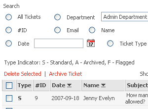 Search for TicketsYou are able to search for tickets by department, ticket ID, name, email, date, ticket type and status. |
