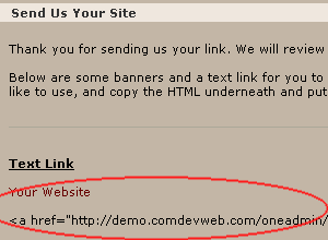 Request Link BackOnce the link is submitted, the page will display a link back URL or HTML code to let them input in their web pages for link back purpose. You can choose to use text link or upload images for link back. |