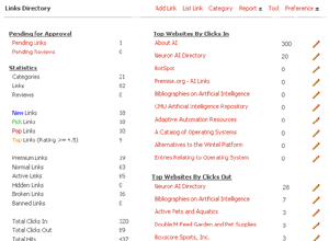 View Statistics and ReportsYou can view the statistics of your Links Directory. It shows you the total click-ins, click-outs, number of links in various classifications, and top websites that contribute to your traffic. |