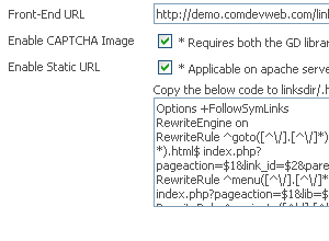 Search Engine FriendlyComdev Links Directory is search engine friendly. You can enable the option in the Preference area. For example, search engine friendly URL is like http://www.abc.com/link-1-2.html instead of passing the link values using parameters. Once you have enabled the option, copy the generated code into your .htaccess file. |
