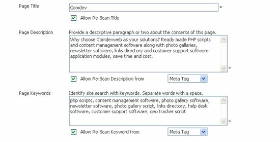 To perform re-scan on the site pages, please select the page url from the list. Then, click on 'Re-Scan' button. Only the Title, Page Description and Page Keywords Option check will be scan. (Note : Only Page Title, Page Description, Page Keywords will be updated without blank values only.)