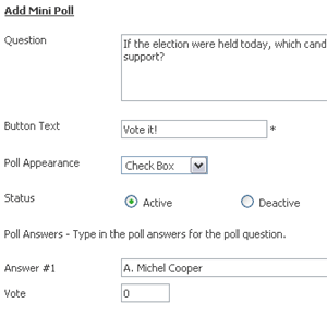 Poll Question and AnswersYou are able to create multiple polls, write it question and provide the answer options. Set the poll option as checkbox or radio button. |