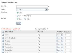 Add Your PageAdd your web pages and links to your Site Map. Organize it with parent page, sub pages and the display sequence. |