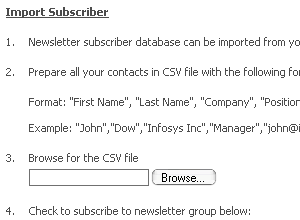 Import from CSV FileIf you have your subscribers database in other application, you can import it easily using CSV format file. Follow the instructions and upload the file for import. |