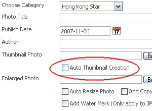 Auto Thumbnail CreationPhoto thumbnail is the smaller size photo displayed in your photo album. You can upload it manually or choose to automatically create the thumbnail from its larger photo. This auto thumbnail creation tool saves you time if you do not want to create them manually with graphic software in your PC. |