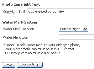 Copyright Text and WatermarkYou may not want people to use your photos without your permission, add copyright text to your photos when you upload them with Photo Gallery. You can also include watermark in PNG format. |