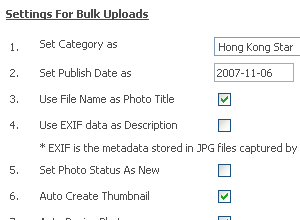Bulk Upload SettingsBesides using Add Photo as the normal upload method, you can use Bulk Upload to speed up your upload process. In Bulk Upload, choose the settings before you start to upload. For example, choose which category you wish to upload all the photos, use the filename as title, auto create thumbnails, resize photos and so forth. |