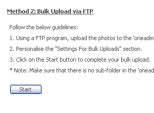 Method 2: Using FTPUsing Method 2 with FTP allows you to upload many of your photos with larger file size and avoid the time out and file size issues in Method 1. First, upload all your photos to the 'oneadmin/_files/photo_ftp' folder and click on 'Start' button to complete the process. |