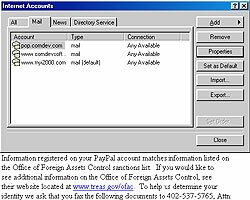 The default Outlook Express setting does not configured to the email account you have, you need to configure it to make it able to send and receive the email. In Outlook Express, you can configure to multiple email account so that it can check your email from multiple email servers. Following steps shows how to configure an email account, repeat the same steps to configure for other email accounts.