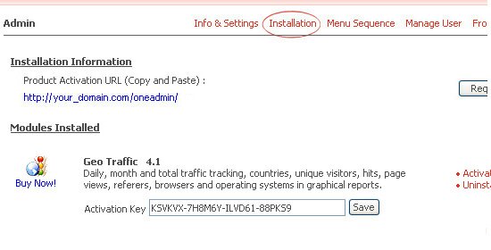- Click on 'Installation' to install your Geo Traffic using a product activation key. To obtain the activation key, please visit http://www.comdevweb.com/supportkey.php.