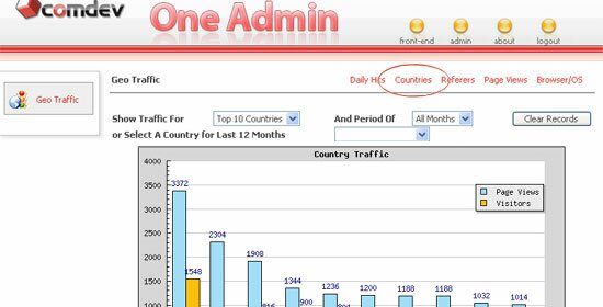 - To view only certain countries statistic, select a country for the last 12 months from the drop down list to view total pages viewed and the total of uniques visitors. Click 'Clear Records' to remove all countries data and capture new hits again.